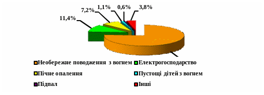 Отже, в більшості причин виникнення пожеж (більше 60%) головну роль відіграє “людський фактор” (необережне поводження з вогнем, паління, експлуатація електроприладів, пічного опалення, пустощі дітей з вогнем тощо).