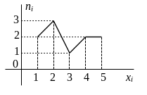 Каждая варианта может встречаться один или несколько раз. Количество ее появлений ni в выборке называется ее частотой, а отношение ni/n частоты к общему объему выборки называется относительной частотой. Диаграмма, на которой показаны значения частот или относительных частот для вариант выборки, называется полигон частот. На этой диаграмме значения частот для каждой варианты отмечаются точками, и эти точки последовательно соединяются отрезками.