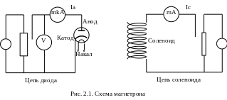 Цепь соленоида. Цепь питается источником постоянного тока. Для регулировки тока в соленоиде в цепь включен реостат. Сила тока в соленоиде Iс измеряется миллиамперметром.