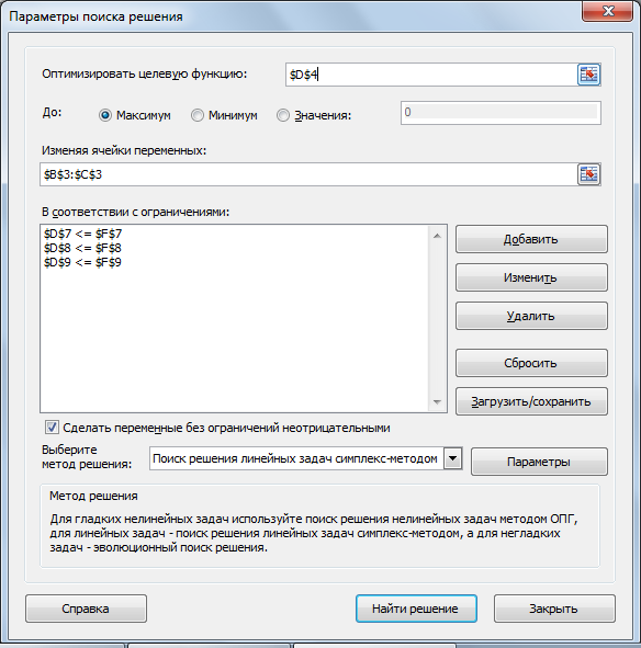 укажите метод решения Поиск решения линейных задач симплексным методом (рис. 21);