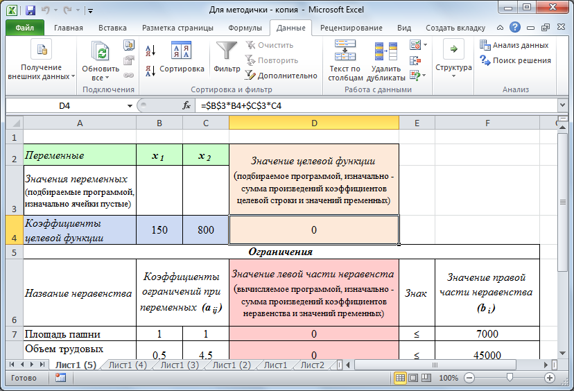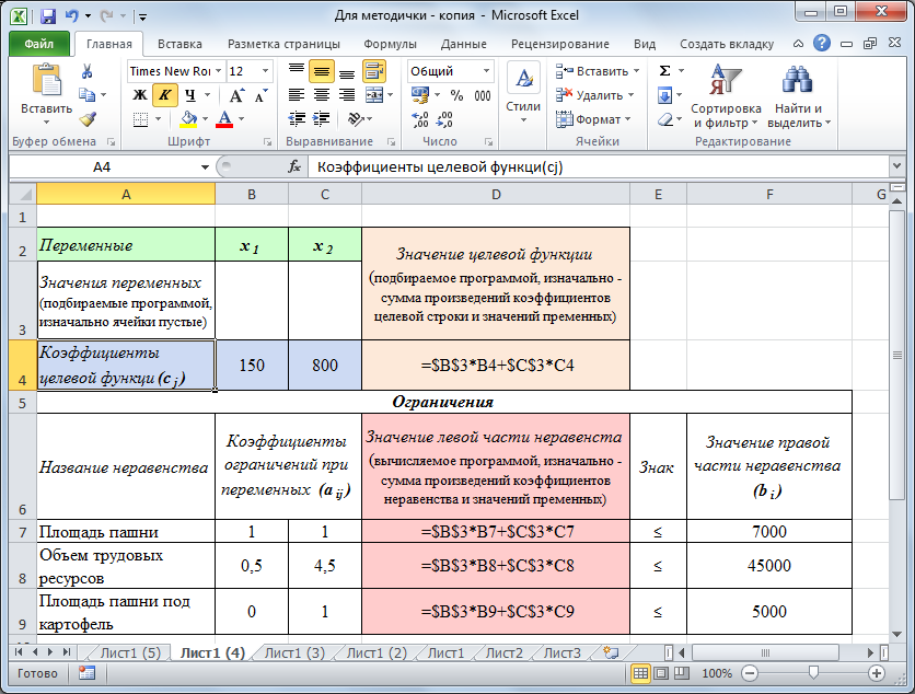 4. Ввод формул для вычислений значений целевой функции и левой части неравенств