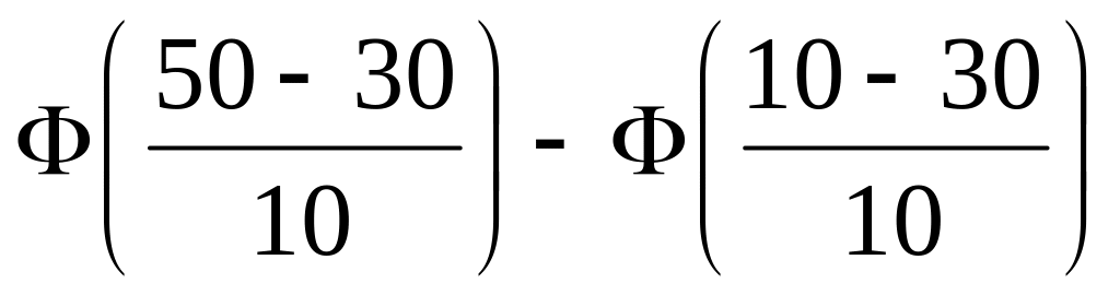 Пример. Случайная величина X распределена по нормальному закону. Математическое ожидание и среднее квадратическое отклонение этой величины соответственно равны 30 и 10. Найти вероятность того, что X примет значение, принадлежащее интервалу (10,50).
