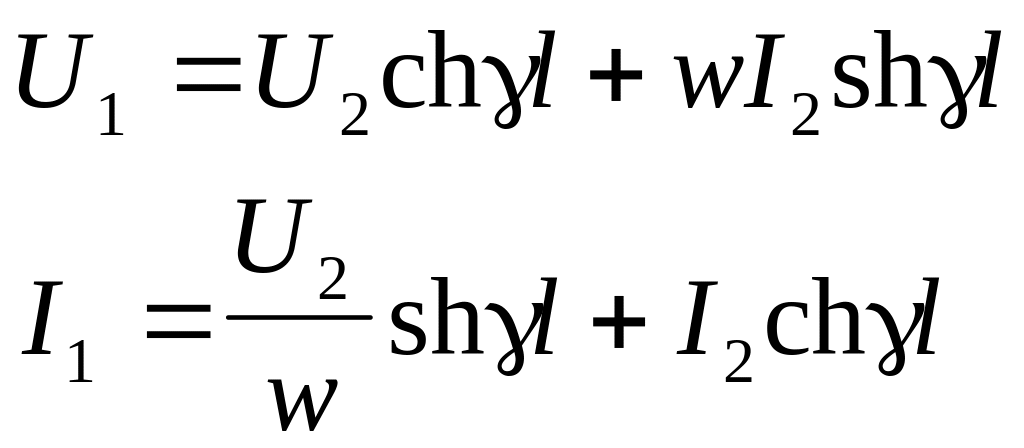 Это – уравнения передачи отрезка линии произвольной длины, они имеют форму соответствующих уравнений четырехполюсника. Коэффициенты уравнений образуют матрицу передачи.