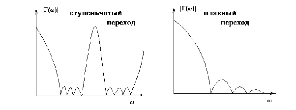 Отметим, что при оптимальной характеристике согласования плавный переход получается длиннее ступенчатого из-за избыточности по полосе (поскольку последний является полосовым фильтром, а плавный - фильтром ВЧ).