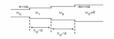 1) Многосекционный четвертьволновый трансформатор. Это – несколько каскадно включенных отрезков с разными волновыми сопротивлениями, длина каждого отрезка l= /4, где соответствует центральной рабочей частоте.