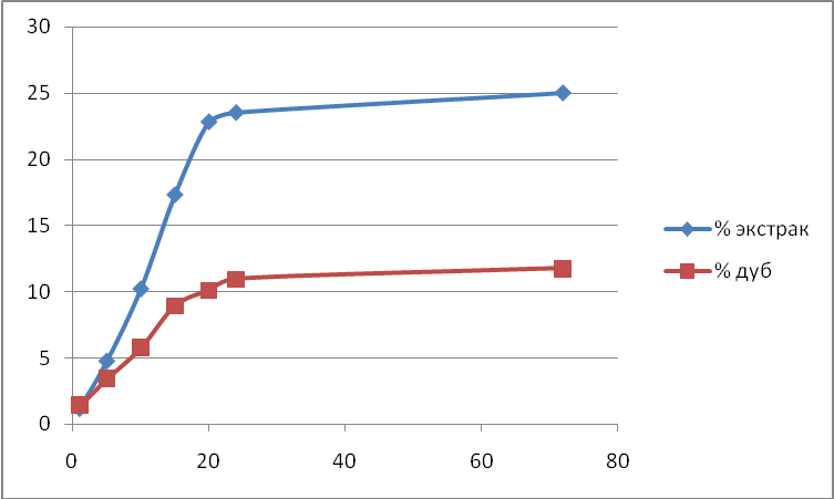 Для определения равновесной концентрации измельченные корни шиповника собачьего (5,0 г) загружали в перколяторы и заливали экстрагентом с учётом коэффициента поглощения до образования «зеркала». Настаивали сырье в течение 5, 10, 15, 20, 24, 72 часов в 6-ти перколяторах. Через каждый указанный промежуток времени производили сливы извлечений из перколяторов. В полученных извлечениях определяли содержание экстрактивных и дубильных веществ.