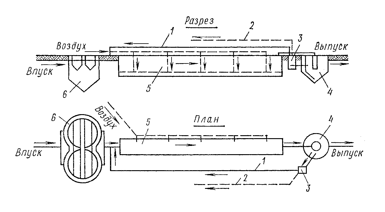 Термин аэротенк, образован от слов аэро – воздух и тенк – бак, резервуар. Конструктивно аэротенк представляет собой резервуар, глубиной 3 – 6 метров и шириной 6 – 10 метров, рис. 3.14.4, в котором медленно движется смесь сточной жидкости, предварительно осветленной в первичном отстойнике и активного ила. Общая длина аэротенка обычно составляет от 50 до 130 метров.