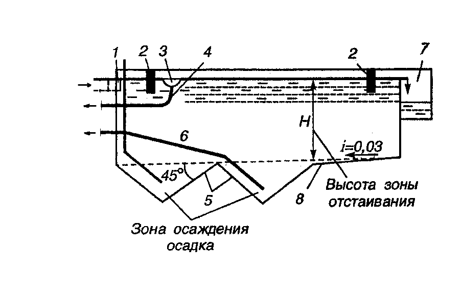 1 – входной лоток; 2 – полупогружные перегородки; 3 – лоток для сбора жира и плавающих взвесей; 4 – труба для отвода жира и плавающих взвесей (жировая труба); 5 – приямки для сбора осадка; 6 – труба для удаления осадка; 7 – сборный лоток для отвода осветленной воды; 8 – днище отстойника.