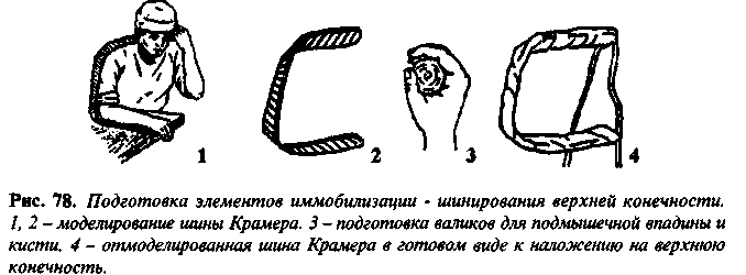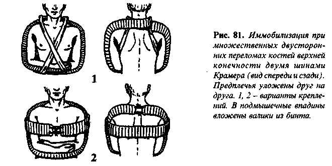 Множественные, особенно двусторонние переломы костей верхней конечности. Фиксируются кисти и три сустава обеих конечностей. Иммобилизация осуществляется с помощью двух или трех шин Крамера; можно использовать также любые подручные средства - важен единый принцип: каждый сегмент конечности со сломанными костями должен быть надежно иммобилизирован в максимально щадящем положении.