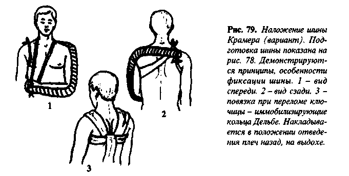 Вложить в подмышечную впадину на стороне травмы ватно-марлевый валик, укрепить его бинтом через противоположное надплечье. Другой валик вложить в кисть, придать ей среднее положение. Наложить по тыльной стороне конечности подготовленную шину. Фиксировать верхний отдел шины за ее конец на предплечье бинтом. Фиксировать конечность и шину друг к другу ходами бинта. Фиксировать шину к туловищу бинтами (рис. 79). Можно уложить конечность на косынку.