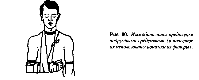 При использовании подручных средств для иммобилизация в случае перелома костей предплечья осторожно согнуть его под углом 90 градусов. Обложить подготовленную шину (например дощечку, фанеру) слоем ваты или мягкой ткани, расправить их фиксировать ходами бинта. Вложить в кисть валик из мягкой ткани. Предплечье уложить на дощечку, обрезанную по его длине, с захватом лучезапястного, локтевого суставов (рис. 80); можно использовать две сложенные полосы фанеры или несколько связанных слоев картона. Такую же дощечку расположить под углом 90 градусов к первой.