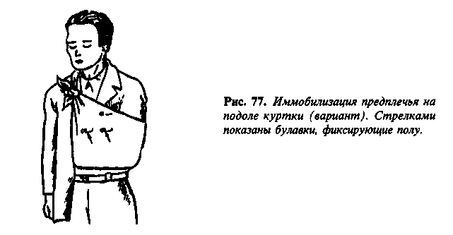 Наложить шину. Боковые отделы лучезапястного сустава, головки пястных костей обложить ватой. Достаточно плотно (но без излишнего сдавления!) фиксировать шину круговыми ходами широкого бинта. Конечность уложить на косынку или на полу пиджака (см. рис. 77), или на поднятый подол рубахи; надежно фиксировать полу английскими булавками.