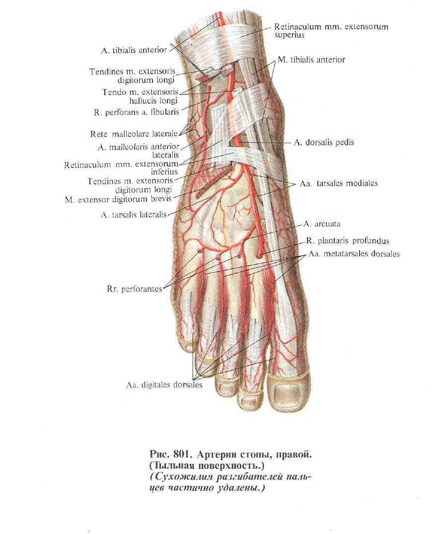 сухожилием по длинному разrибателю пальцев кнаружи, на переднюю поверхность латеральной лодыжки, rде принимает участие в образовании латеральной лодыжковой сети, rete malleolare laterale. По пути анастомо-зирует с r. perforans и rr. malleolares laterales (от a. fibularis) (см. рис. 805). отдавая при этом несколько мелких ветвей к rоленостопному суставу.