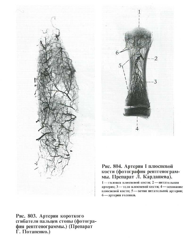 Начальные отделы тыльных плюсневых артерий И, III, IV на уровне оснований плюсневых костей через промежутки между ними анастомози-руют посредством прободающих ветвей, rr. perforantes, с подошвенными плюсневыми артериями, аа. metatarsales plantares. На уровне rоловок плюсневых костей или несколько ди-стальнее каждая тыльная плюсневая артерия разделяется на две тыльные пальцевые артерии, аа. digitales dorsales, направляющиеся кпереди и залеrающие вдоль обращенных один к друrому краев тыльной поверхности пальцев.