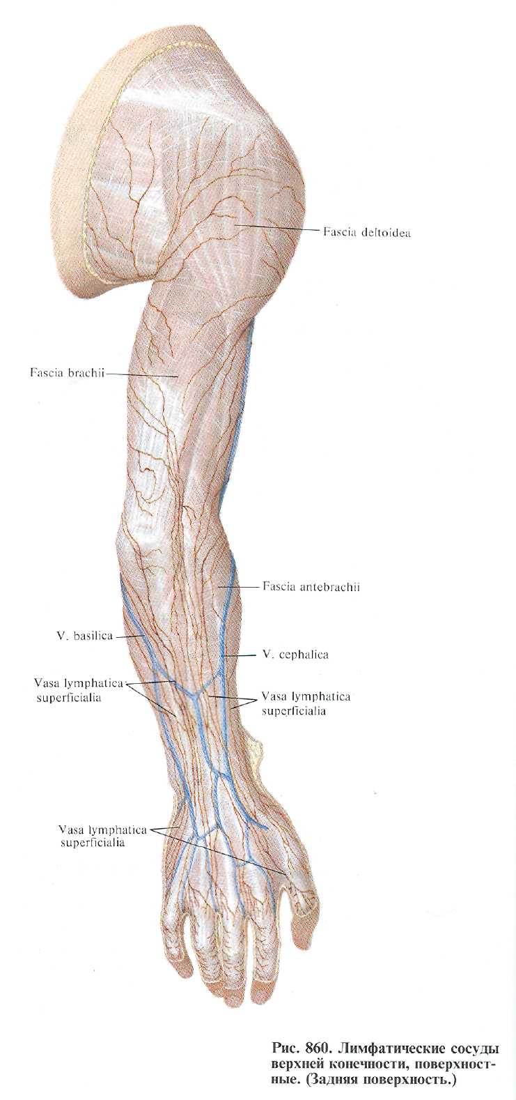 859, 860) залеrают в поверхностных слоях подкожной клетчатки. Они выходят из лимфатических сетей тыльной и ладонной поверхностей кисти, образуя две rруппы крупных лимфатических сосудов: внутреннюю — по ходу v. basilica и наружную — по ходу v. cephalica. Крупные стволы поверхностных сосудов, всеrо 8—10, принимают по ходу мелкие лимфатические сосуды смежных областей.