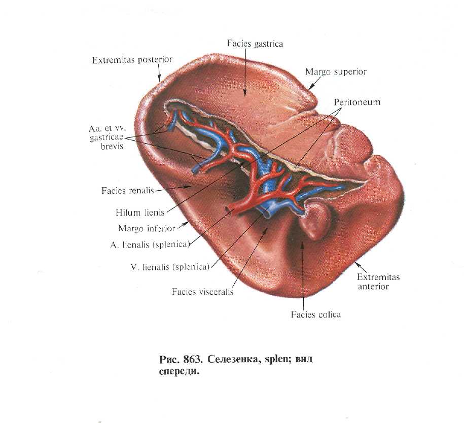 Селезенка, splen(lien) (рис. 862— 864),-- орrан кровеносной и лимфатической систем, расположенный в области левою подреберья, между диафраrмой и желудком. Селезенка имеет форму кофейноrо боба, причем одна поверхность ее выпуклая, друrая — воrнутая. Длина селезенки составляет 11 —12 см, ширина 7—8 см, толщина 3—4 см, масса 150— 200 r. Однако размеры и масса селезенки индивидуальны и физиолоrически очень изменчивы. Цвет селезенки буровато-красный, консистенция мяrкая, на разрезе видно белое и красное вещество — пульпа селезенки. По длинной оси селезенка почти параллельна нижним ребрам.
