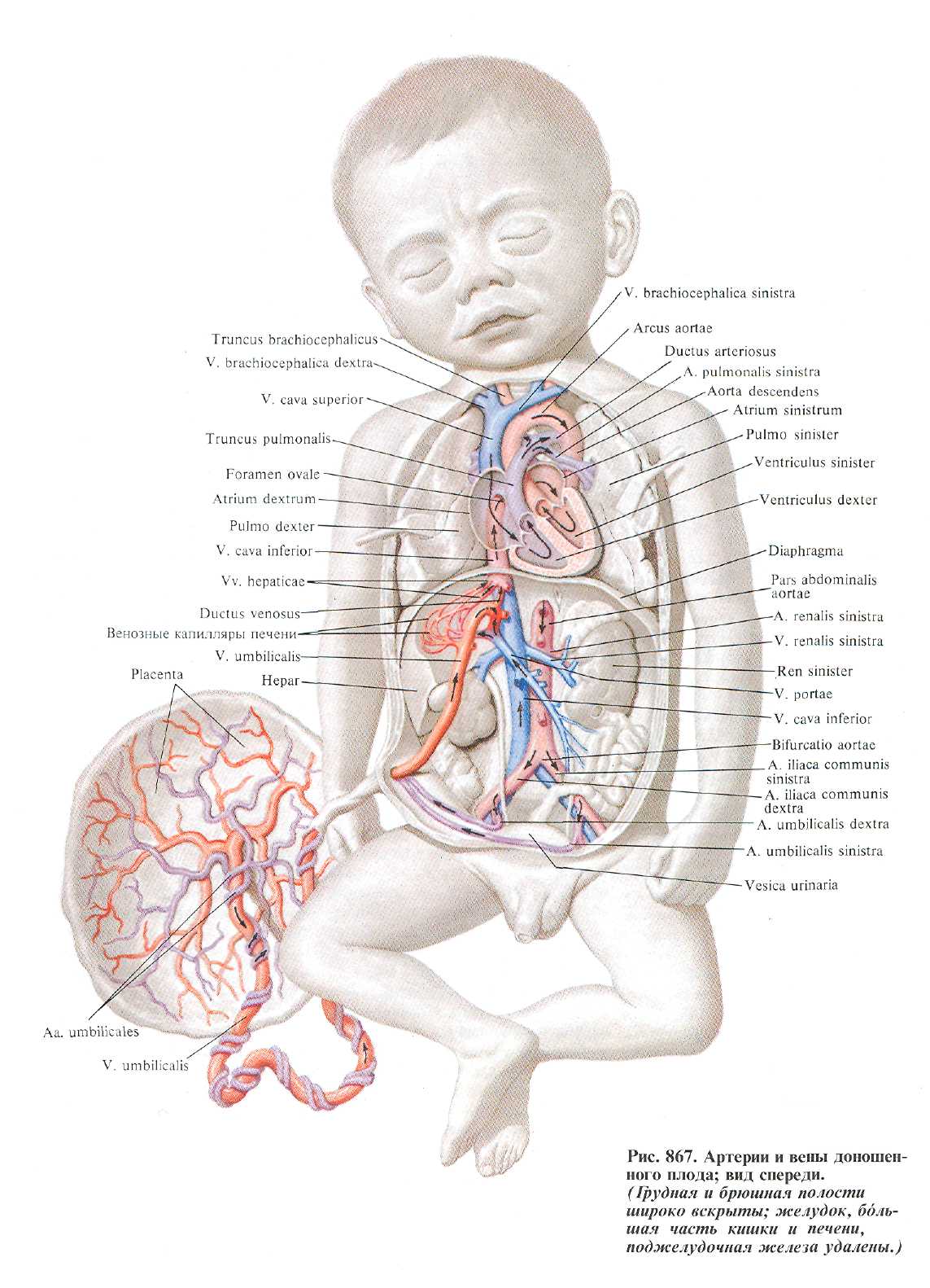 В плаценте, placenta (рис. 867), начинается своими корнями пупочная вена, v. umbilicalis, по которой окисленная в плаценте артериальная кровь направляется к плоду. Следуя в составе пупочноrо канатика (пуповины), funicutus umbilicalis, к плоду, пупочная вена входит через пупочное кольцо в брюшную полость, направляется к печени и входит в толщу ее. Здесь, в паренхиме печени, пупочная вена соединяется с сосудами печени и под названием венозноrо протока, ductus venosus, вместе с печеночными венами приносит кровь в нижнюю полую вену, V. cava inferior.