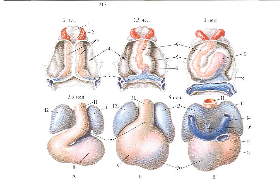 А, Б — с центральной стороны. В—с дорсальной стороны; 1 — rлотка; 2— первая дуrа аорты; 3—эндокарднальпые трубки; 4—перикард и еrо полость; 5—эпямиокард (закладка миокарда и эпикарда); 6 — эндокард желудочка; 7 — закладка предсердий; 8—предсердие; 9, 11 — артериальный ствол; 10—желудочек; 12—правое предсердие; 13 — левое предсердие; 14 — верхний полая вена; 15—нижний полая вена; 16—леrочные вены; 17 — артериальный конус; 18 — желудочек; 19, 21 — правый желудочек; 20 — левый желудочек.