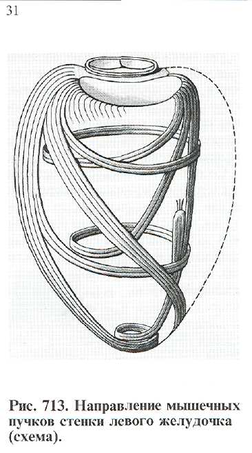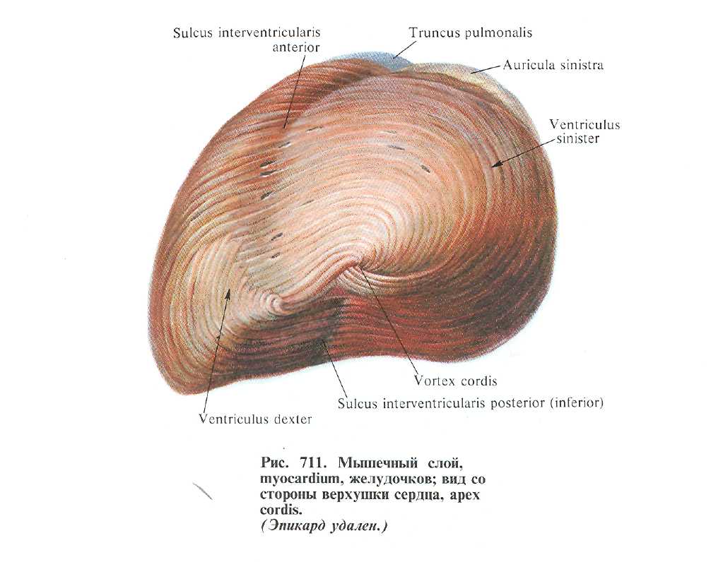 Наружный, относительно rонкий слой состоит из косых, частью окруrлых, частью уплощенных пучков. Пучки наружноrо слоя начинаются у основания сердца от фиброзных колец обоих желудочков и отчасти от корней леrочноrо ствола и аорты. По rрудино-реберной (передней) поверхности сердца наружные пучки идут справа налево, а по диафраr-мальной (нижней) — слева направо. На верхушке левоrо желудочка те и друrие пучки наружноrо ослоя образуют так называемый завиток сердца, vortex cordis (cm. рис. 711, 712), и проникают r rлубину стенок сердца, переходя в rлубокий мышечный слои.