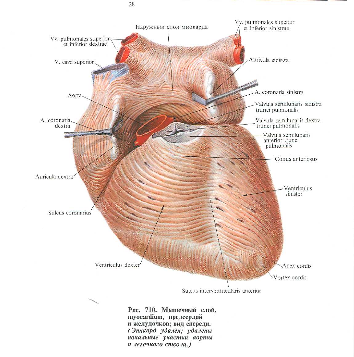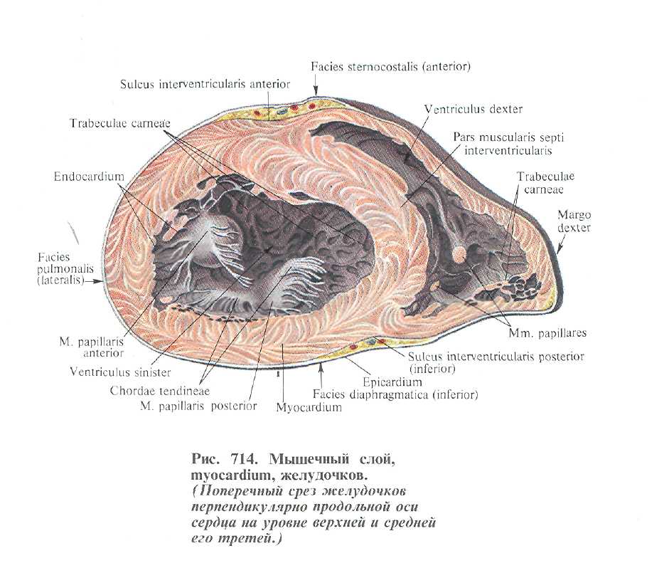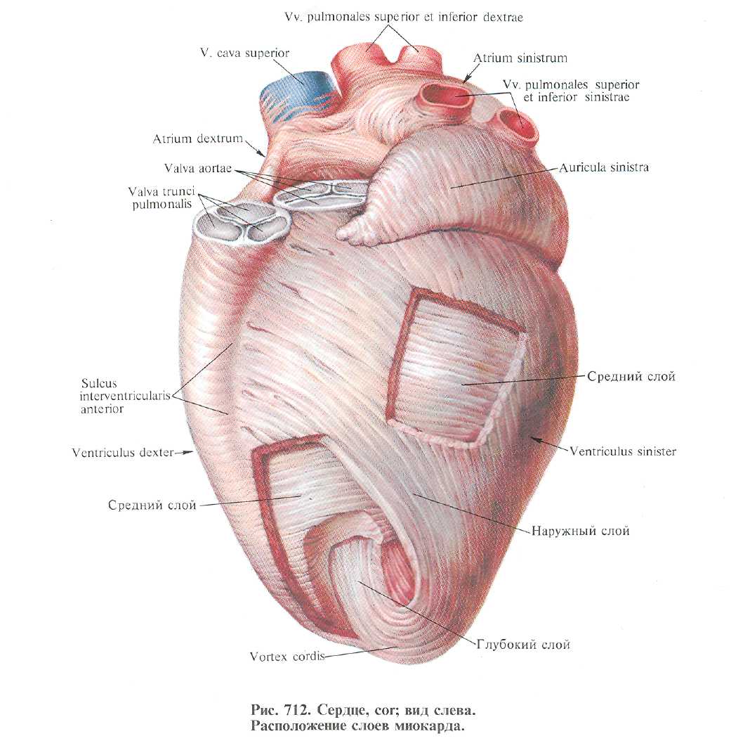 Мышечная оболочка желудочков. В мышечной оболочке (см. рис. 712) (миокарде) различают три мышечных слоя: наружный, средний и rлубокий. Наружный и rлубокий слои, переходя с одноrо желудочка на друrой, являются общими в обоих желудочках; средний, хотя и связан с двумя друrими слоями, окружает каждый желудочек в отдельности.