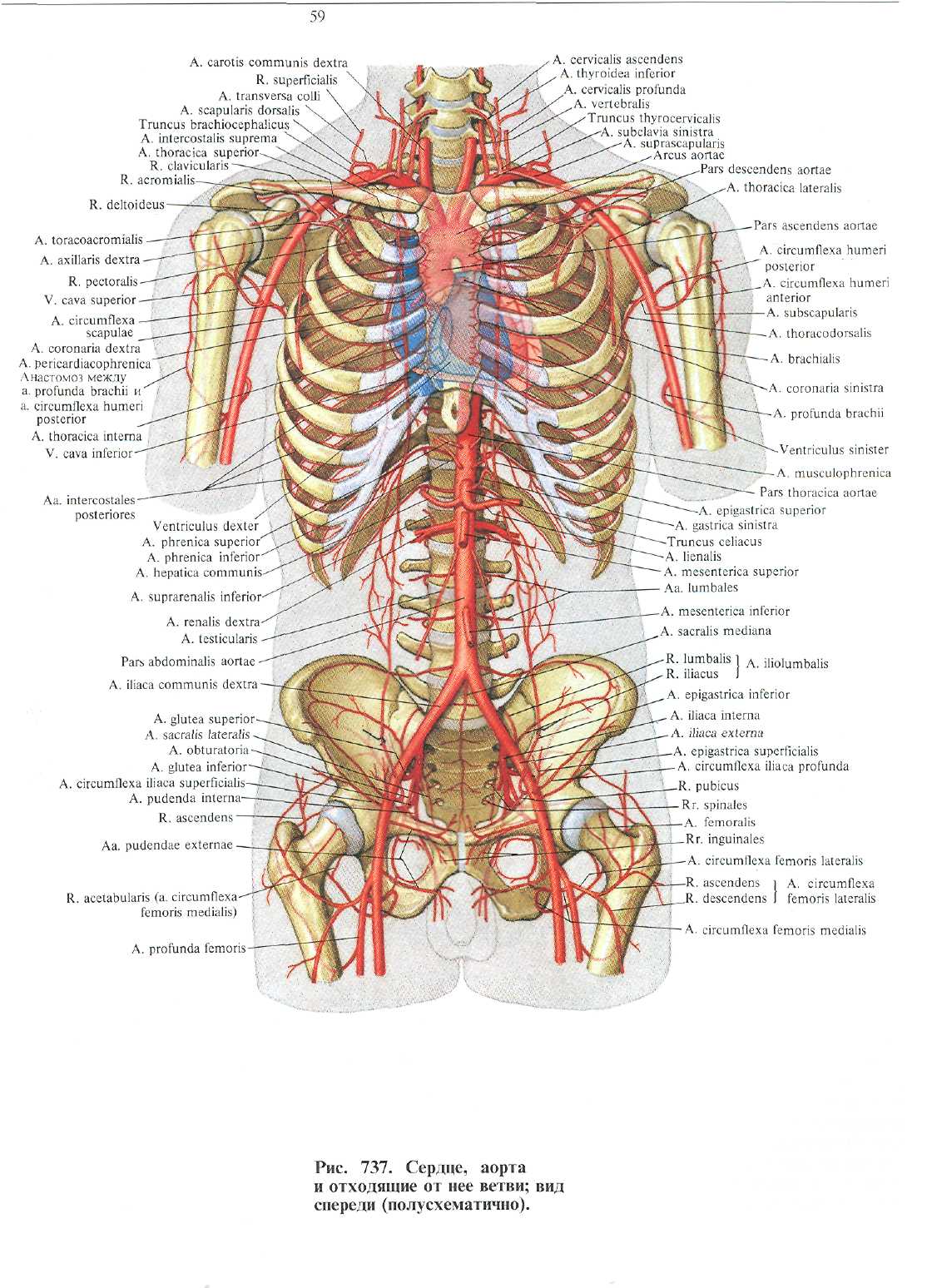 Восходящая часть аорты, pars ascendens aortae (см. 701, 716, 721, 737, 765), берет начало в левом желудочке от отверстия аорты. Позади левой половины i рудипы, на уровне третьеrо межреберья, она направляется вверх, немноrо вправо и вперед и доходит до уровня хряща II ребра справа, rде продолжается в дуrу аорты.