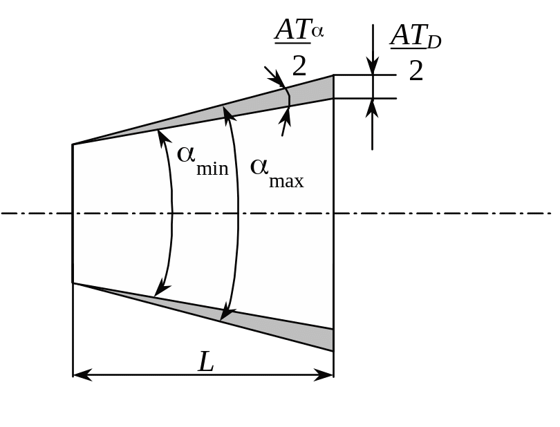 Допуск угла конуса АТD – допуск на разность диаметров в двух нормальных к оси сечениях конуса на заданном расстоянии L между ними. Допуск угла конуса АТD назначают на конусы, имеющие конусность не более 1:3.