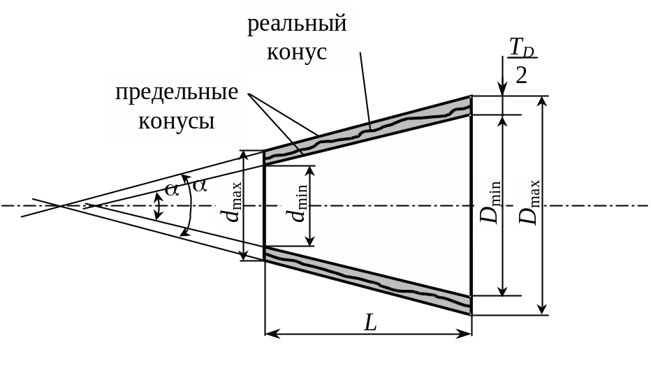 по допуску диаметра ТD, одинаковому в любом поперечном сечении конуса. Допуск ТD ограничивает также отклонение угла конуса и отклонение формы конуса, если они не ограничены меньшими допусками.