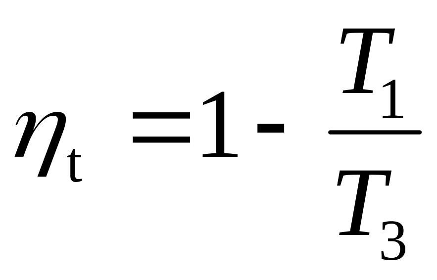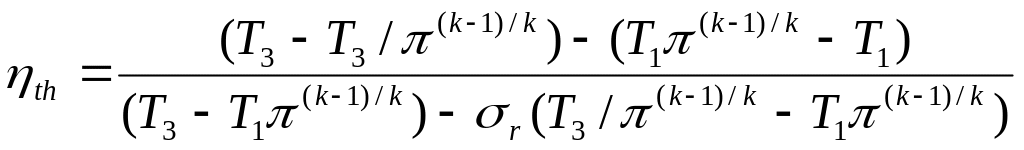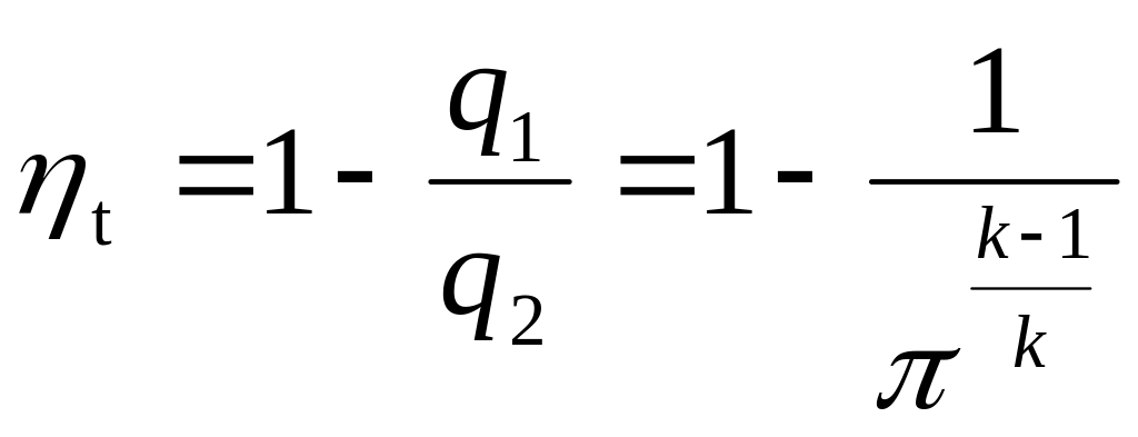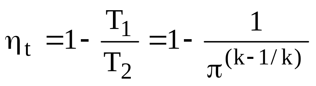 Сжатие воздуха в компрессоре и расширение продуктов сгорания в турбине происходят в адиабатных условиях, термический кпд газотурбинной установки определяется по формукле: