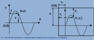 Проблема: функція задана в математичній системі координат, будувати потрібно на екрані, вказуючи координати в пікселях.