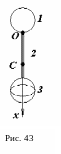 Фізичний маятник здійснює коливання відносно осі, яка проходить перпендикулярно рисунку через точку О (рис. 43). Записати рівняння вільних коливань цього маятника та визначити період цих коливань. Тіло 1 є однорідний диск масою = 4 кг та радіуса = 0,4 м, тіло 2 – однорідний стрижень масою = 3 кг та довжиною = 0,8 м, тіло 3 – однорідна куля масою = 4 кг та радіуса = 0,4 м.