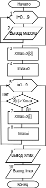 Задача 1. В массиве X из 10 элементов вычислить наибольший элемент массива и его номер.