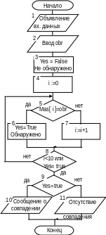 Поиск осуществляется последовательным сравнением элементов массива с образцом до тех пор, пока не будет найден элемент, равный образцу, или пока не будут проверены все элементы.