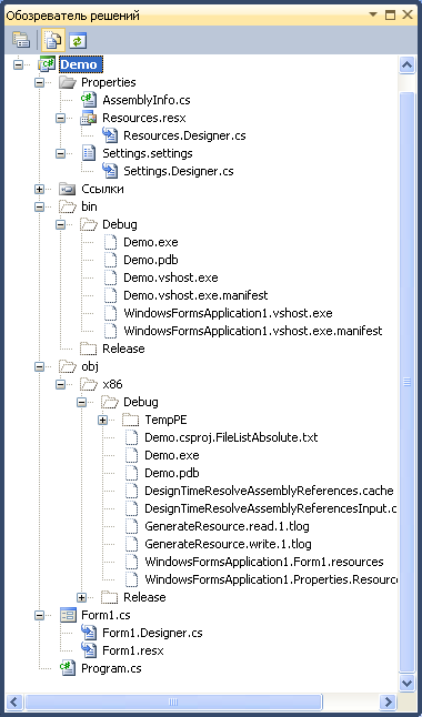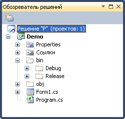 Решение P Demo Properties Ссылки bin Debug Demo.exe Demo.pdb Demo.vshost.exe Release obj |
