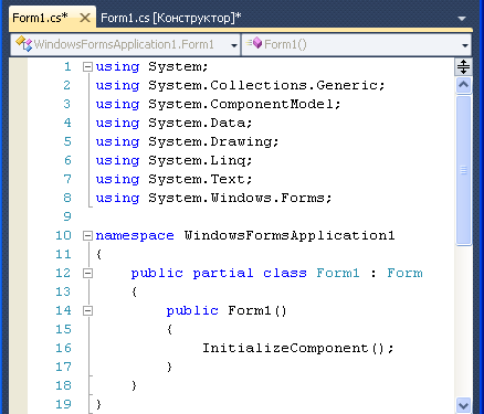 В Окне Редактора кода отображаются стандартные модули, пространство имен, объявленный по умолчанию класс Form1 и инициализация объектов, установленных на форме.