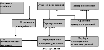 (формулирование) проблемы и обозначение её границ. Затем нужно определить критерии, по которым будут оцениваться предлагаемые решения, и сформулировать все возможные варианты этих решений (выделить альтернативы поведения фирмы на рынке или альтернативы, касающиеся разработки новых моделей товара). Затем наступает этап сравнения всех возможных альтернатив с критериями и на основе этих сравнений выбирается одно, приемлемое для фирмы решение. При этом возможен возврат к прежним этапам процедуры принятия решения. Весь этот процесс представлен на рисунке 2.