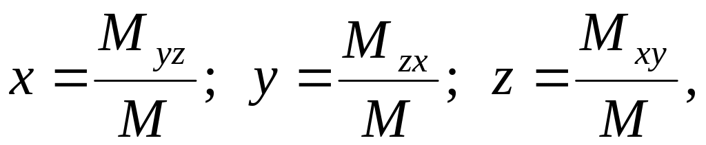 2) Центр тяжести можно определить как такую точку, что если в ней сосредоточить всю массу системы, то ее статистический момент относительно какой-нибудь оси будет равен соответствующему статистическому моменту всей системы. Координаты центра тяжести определяются по формулам: