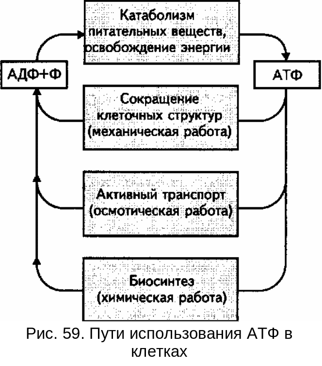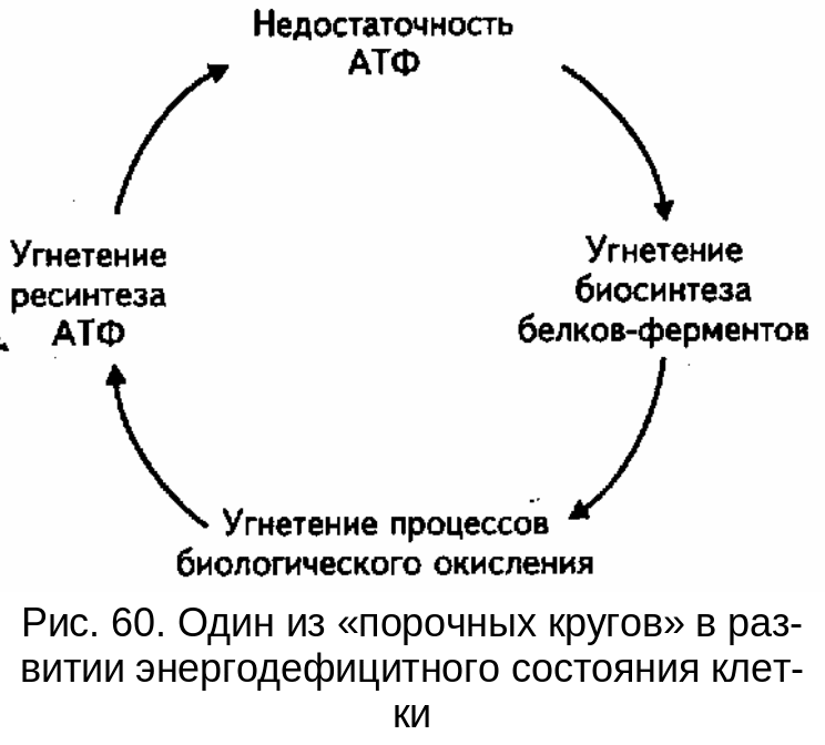 Недостаточность АТФ в клетке является причиной нарушений ее белоксинтетяческих функций. Страдает синтез всех белков, в том числе и белков-ферментов. Это ведет к нарушению катаболических превращений питательных веществ в клетке и процессов биологического окисления – дефицит АТФ увеличивается (рис. 60).