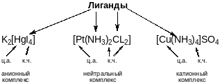 Центральный атом с лигандами образует внутреннюю сферу комплексного соединения, она обычно заключается в квадратные скобки и называется комплексной частицей. Если частица заряжена положительно, комплекс называется катионным, если заряжена отрицательно - анионным, если не заряжена - нейтральным. Заряд комплексной частицы нейтрализуется ионами противоположного знака, они образуют внешнюю сферу комплексного соединения.