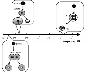 Все вещества состоят из атомов и молекул. При воздействии излучения (в том числе и солнечного) на вещество, атомы и молекулы могут менять свое состояние, вплоть до разрушения. Чтобы лучше разобраться в этом, вспомните, что атом состоит из ядра и электронной оболочки. Ядро атома состоит из нейтронов и протонов. Если хватило сил изменить состав атомного ядра, то это называется ядерной реакцией – превращением атома одного химического элемента в другой. Атомы могут объединяться в молекулы, образуя химические соединения. При внешнем воздействии молекула может «развалиться» на атомы – такое превращение называется диссоциацией молекулы. Если удалось «оторвать» часть электронов от атома (молекулы), то говорят, что произошла ионизация атома (молекулы) - атом распадается на положительный ион и свободные электроны. Диссоциация молекулы и ионизация атома (молекулы) – это химические реакции, приводящие к новым химическим соединениям. В случае химической реакции атомы химических элементов, участвующие в реакции, не превращаются в другие.