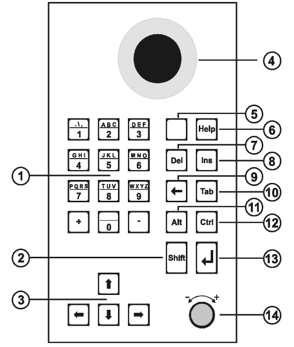 Клавиша 'Shift' в комбинации с другими клавишами позволяет активизировать другие функции, заложенные в некоторых клавишах. Например: доступ в разделы управления при комбинации с клавишами P1 - P7, активизация других функций клавиш буквенно-цифрового блока или включение источника 24 В в комбинации с клавишей RUN .