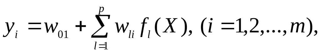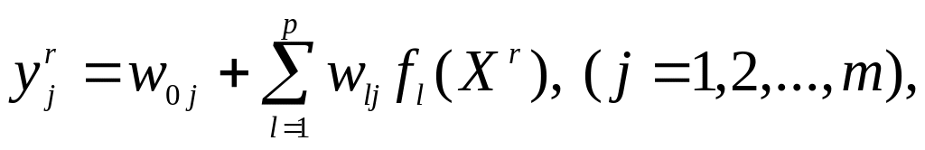 де X = (х1,х2,...,хn)T – вхідний вектор; wli – ваги зв'язків. (l = 1,2,...,р, i = 1,2,...,m); w0i – зсув по i-му виходу мережі. Функції f (X) – це функції активації нейронів схованого шару, визначені як