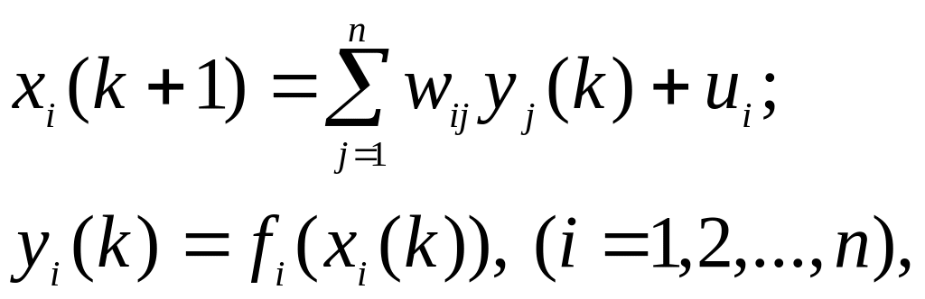 де хі – сумарне порушення (змінна стану) і-го нейрона; fi (•) – функція активації нейрона; к- дискретний час.