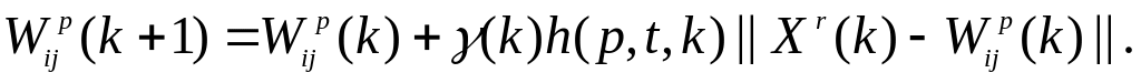Тут Wij – ваговий вектор нейрона з координатами (i,j); h(p,t,k) – функція притягання р- го й t-го нейронів; γ = 1/2,(k = 1,2,...); || – норма відповідного вектора.