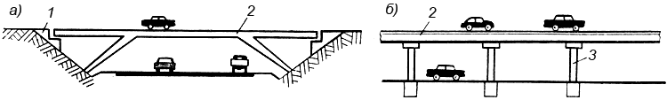Эстакада – мостовая конструкция для пропуска дороги над поверхностью земли так, чтобы нижележащее пространство могло быть использовано для проезда или других целей. Эстакады часто сооружают в городах на пересечениях улиц или вдоль них, а за городом на сложных пересечениях автомобильных дорог, на болотах и т.п. (рис.11б)