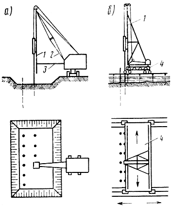 Последовательность забивки сваи должна быть такой, при которой сводятся к минимуму непроизводительные затраты времени на перемещение копра или крана. Во избежание сильного уплотнения грунта при большом количестве свай их следует забивать по спирали, начиная от середины, и идти к краям (рис.193, б) или применить секционную последовательность (рис.193, в), а для свайных фундаментов, вытянутых в плане, - рядовую (рис.193, а). Принципиальные схемы забивки свай на суходоле приведены на рис.194, а, а в водотоке с применением подмостей - на рис.194, б и понтонов - на рис.195, а, б.