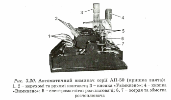 Деякі типи автоматичних вимикачів серії АП-50 мають також і теплові розчіплювачі (розташовані знизу, на рис. 3.20 не видно). Вони являють собою теплові реле, схема вмикання яких є аналогічною до наведеної на рис. 3.9.