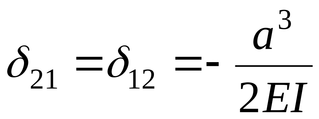 Для обчислення δ12 треба епюру М, зображену на мал. 29 помножити на епюру М, зображену на мал. 30. По правій стійці отримаємо нуль, оскільки всі ординати першої епюри тут дорівнюють нулю. По лівій стійці отримаємо нуль: площа прямокутника (мал. 29) рівна а∙2а = 2а2, але ордината другої епюри (мал. 30), відповідна центру тяжіння прямокутника, дорівнює нулю. По ригелю отримаємо: