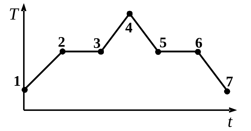 Н а графике (см. рисунок) представлено изменение температуры Т вещества с течением времени t. В начальный момент вещество находилось в кристаллическом состоянии. Какая из точек соответствует окончанию процесса отвердевания?