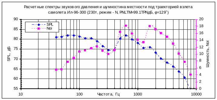 Источники излучения с максимальной интенсивностью и с максимальной шумностью не всегда совпадают. Для примера на рисунке 4.11 сравниваются спектры звукового давления и шумности на местности при взлете самолета Ил-96-300.