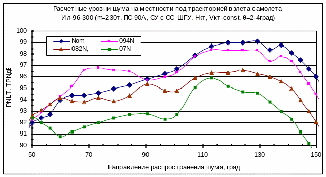 Важной акустической характеристикой магистрального самолета является график изменения уровня воспринимаемого шума на местности при пролете самолета относительно контрольной точки. Данная характеристика дает представление о пространственном распределении шумности суммарного акустического излучения самолета, позволяет определить направления распространения излучения с наибольшей шумностью и сделать заключение о возможных источниках шума силовой установки, излучение которых является определяющим в формировании максимального уровня воспринимаемого шума(PNLTM) самолета на местности, и о предпочтительном месте размещения системы шумоглушения в силовой установке.